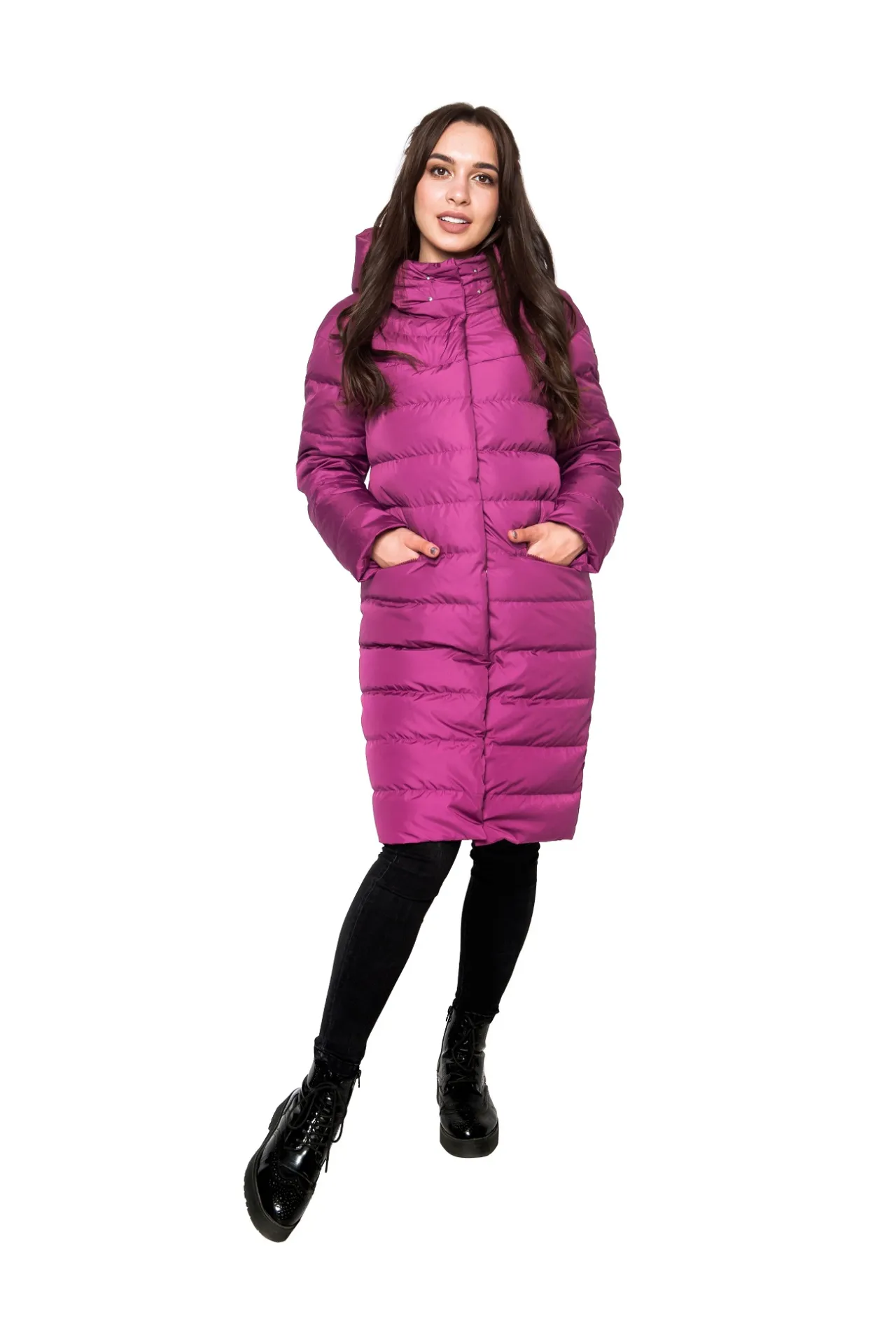 Прямой удлиненный крой визуально стройнит фигуру, позволяя свободно комбинировать пуховик с джинсами, брюками или теплым платьем. Удобный капюшон с высоким воротником защищает голову и шею от ветра и снега, а застежка на молнию с планкой препятствует проникновению холодного воздуха.