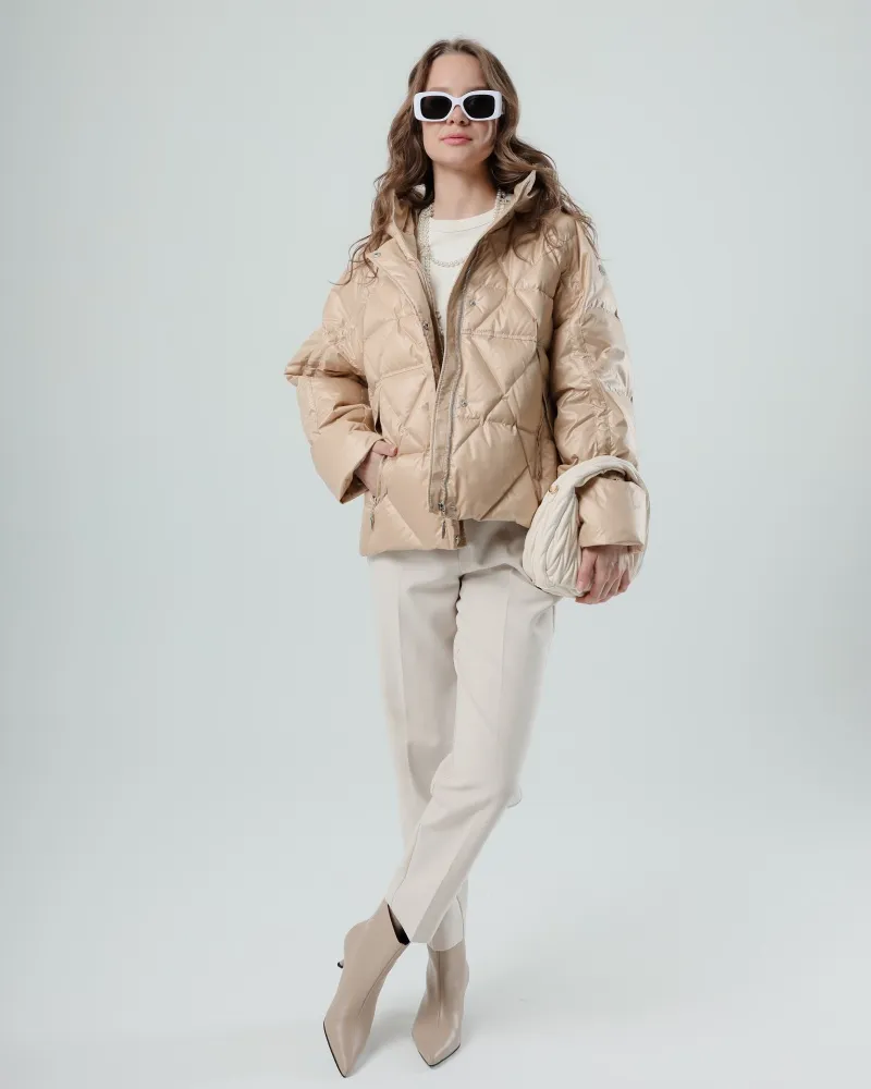 Особенность модели – эффектная стёжка в виде крупных геометрических ромбов, которая не только добавляет динамики силуэту, но и поддерживает равномерное распределение наполнителя. Удобный высокий воротник и регулируемый капюшон создают дополнительную защиту от ветра, а застёжка на молнию и кнопки делает посадку плотной и надёжной. Продуманные карманы на молниях сохранят руки в тепле и уберегут мелочи от потери.