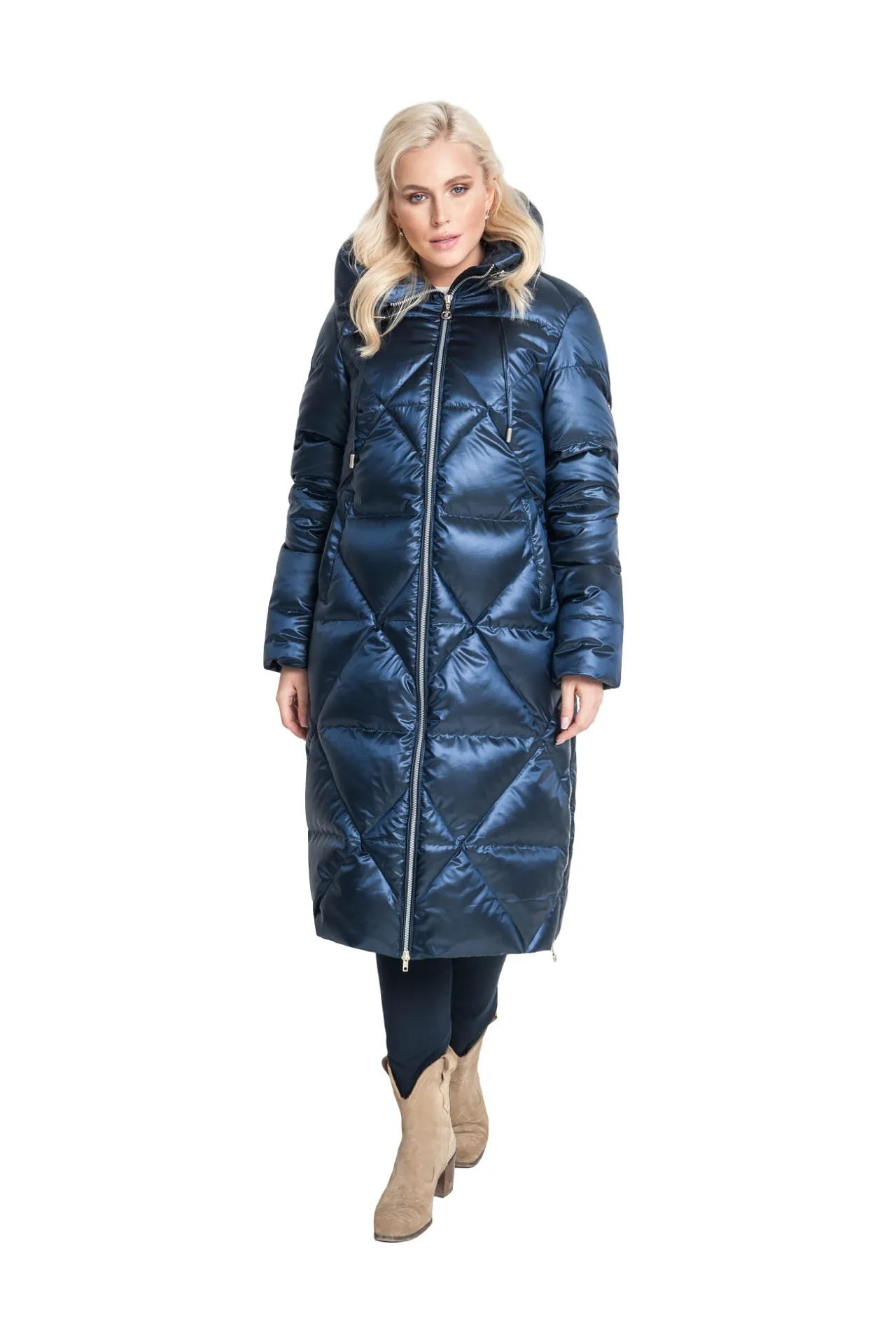 Удлиненный силуэт пуховика надежно прикрывает бедра, создавая дополнительный барьер от ветра и мороза. Особое внимание привлекает оригинальная диагональная стежка, которая не только фиксирует пух равномерно по всей поверхности, но и визуально стройнит, подчеркивая фигуру. Современный крой с удобной посадкой позволяет двигаться свободно и чувствовать себя комфортно в любой ситуации.