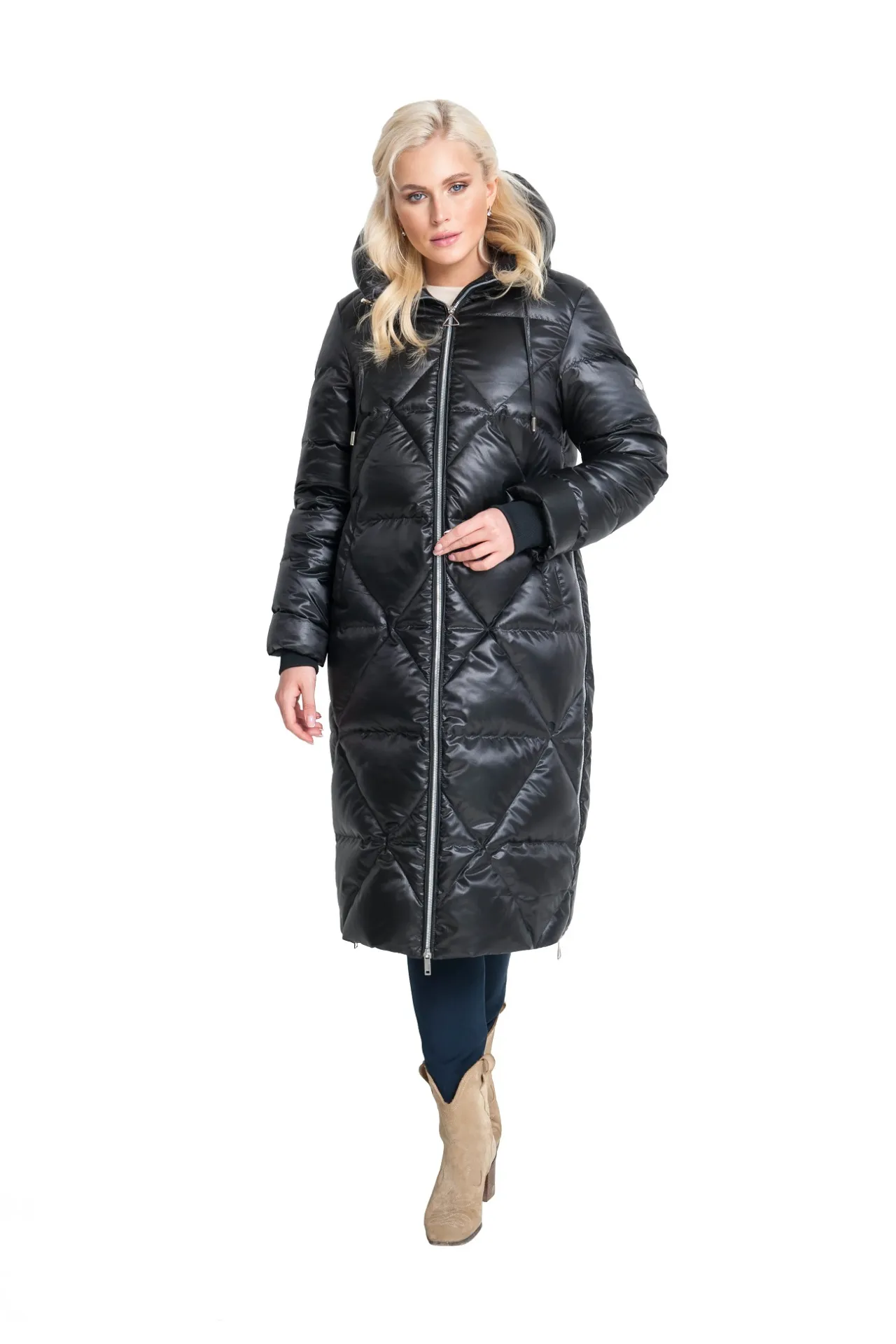 Удлиненный силуэт пуховика надежно прикрывает бедра, создавая дополнительный барьер от ветра и мороза. Особое внимание привлекает оригинальная диагональная стежка, которая не только фиксирует пух равномерно по всей поверхности, но и визуально стройнит, подчеркивая фигуру. Современный крой с удобной посадкой позволяет двигаться свободно и чувствовать себя комфортно в любой ситуации.