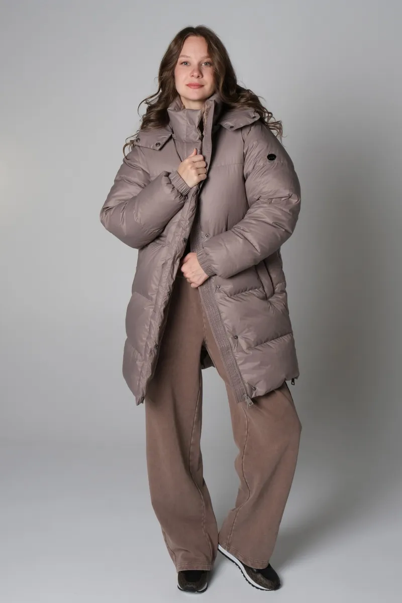 Верх выполнен из прочного ветро- и влагозащитного материала с мягкой матовой текстурой, который надёжно противостоит снегу и порывам ветра, сохраняя сухость и тепло на протяжении всего дня. Удлинённый прямой крой прикрывает бёдра, создавая дополнительную защиту от холода, а высокий воротник и объёмный капюшон с регулируемой посадкой обеспечивают уют и комфорт в непогоду.