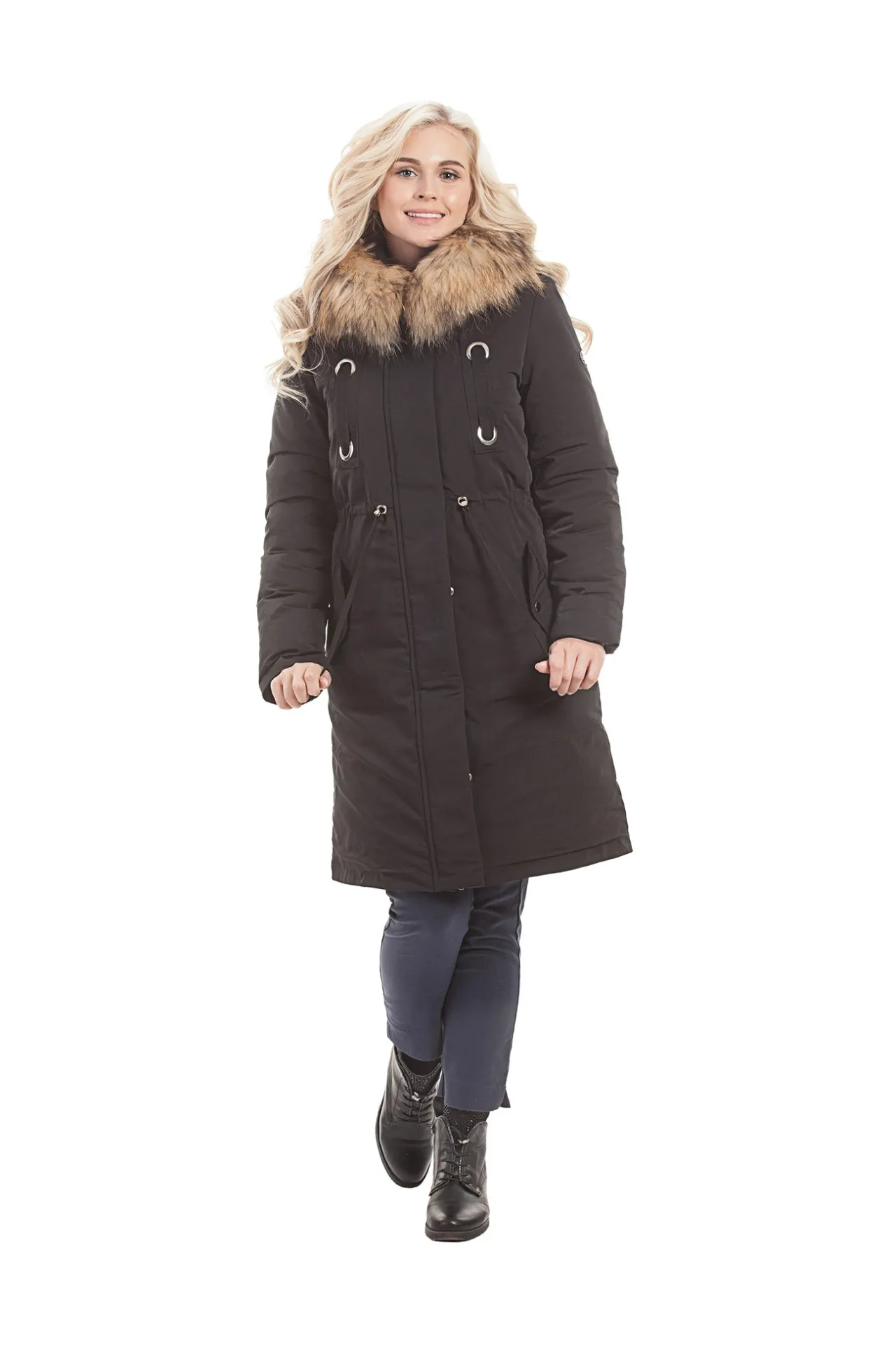 Несъёмный капюшон с натуральной опушкой из енота не только подчёркивает статусный внешний вид изделия, но и обеспечивает дополнительный комфорт в морозную и ветреную погоду. Пышный мех красиво обрамляет лицо, создавая уют и завершённость образа.