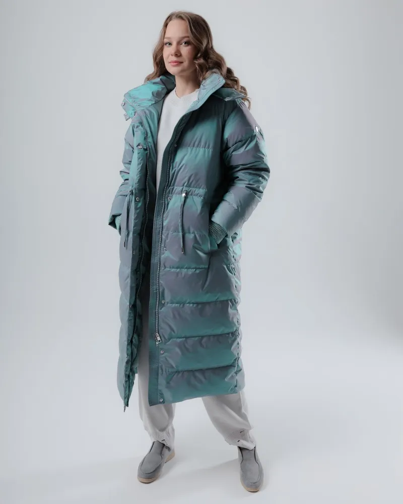 Пуховик представлен в трех оттенках — нежный бежевый, выразительный бирюзовый и глубокий темно-синий. Каждый из них подчеркивает индивидуальность и настроение владелицы, сохраняя при этом сдержанную элегантность. Удобный капюшон защищает от осадков и ветра, а высокое горло добавляет тепла и уюта. Застежка на молнию и кнопки гарантирует надежность, а пояс регулирует посадку, создавая гармоничные пропорции.