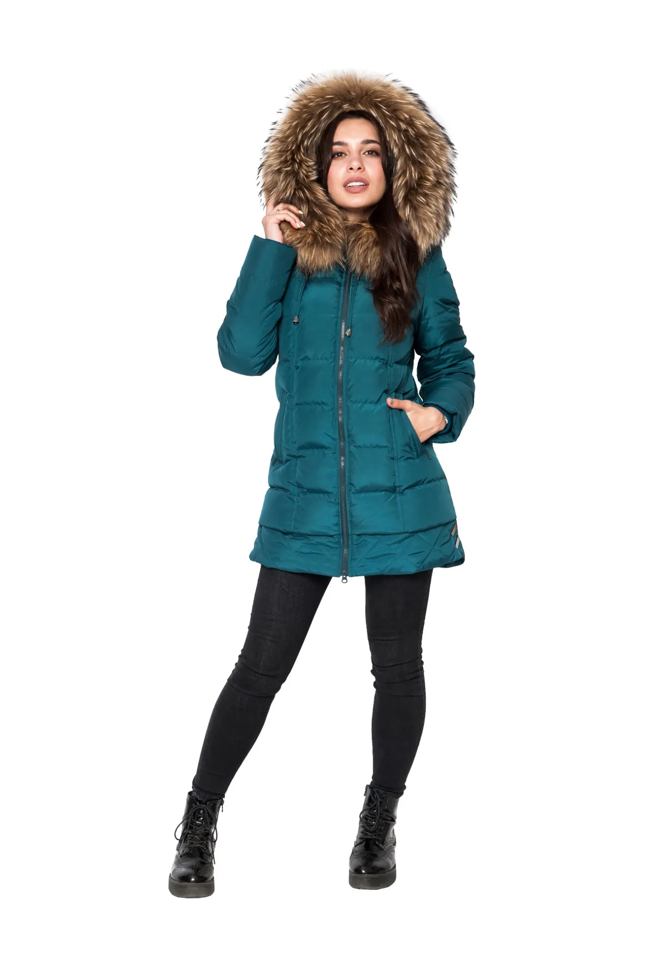 Пуховик имеет продуманный крой, который хорошо сидит по фигуре, не сковывает движения и подходит для активной городской жизни. Съемный капюшон позволяет легко адаптировать модель под разные погодные условия и стилистические задачи. Капюшон украшен натуральным мехом енота — объемным, пушистым и эффектным, он не только придает образу выразительность, но и надежно защищает от ветра и холода.