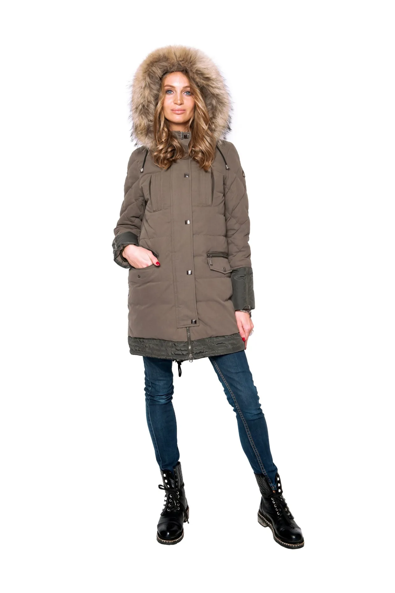 Съёмный капюшон добавляет функциональности: его легко отстегнуть при более мягкой погоде или оставить для дополнительной защиты в мороз. Капюшон украшен эффектной опушкой из меха енота и песца, которая не только усиливает теплоизоляцию, но и придаёт образу выразительность и благородный зимний характер. Мех красиво обрамляет лицо, защищая от ветра и снега.