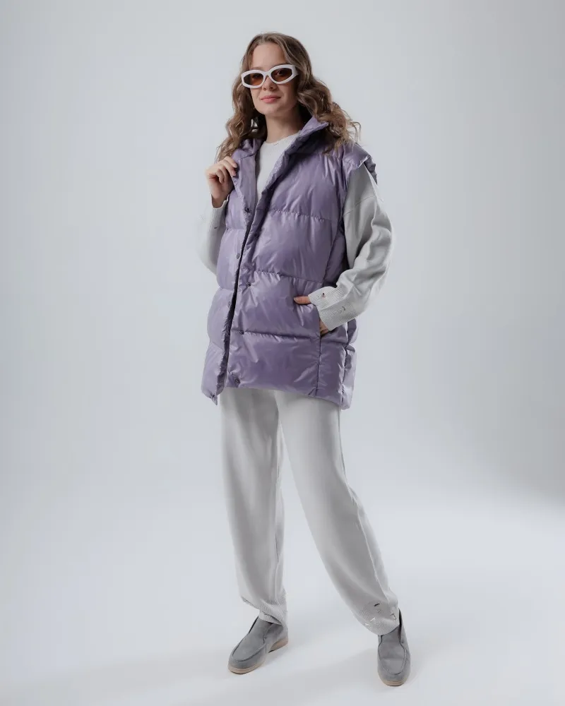 В качестве утеплителя используется 100% натуральный пух, который эффективно удерживает тепло и при этом остается легким и воздушным. Температурный режим до +10 °C делает модель идеальной для прогулок, поездок, активного городского ритма и переменчивой погоды. Жилет удобно надевать поверх свитеров, джемперов, худи и платьев.