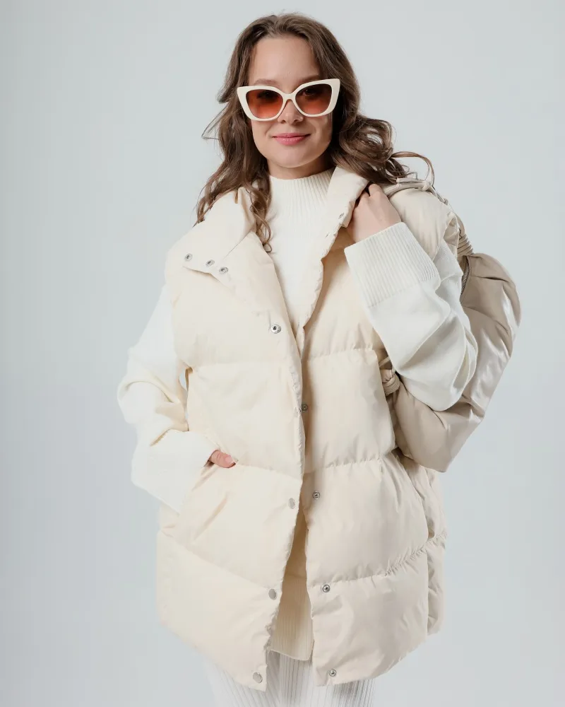 В качестве утеплителя используется 100% натуральный пух, который эффективно удерживает тепло и при этом остается легким и воздушным. Температурный режим до +10 °C делает модель идеальной для прогулок, поездок, активного городского ритма и переменчивой погоды. Жилет удобно надевать поверх свитеров, джемперов, худи и платьев.